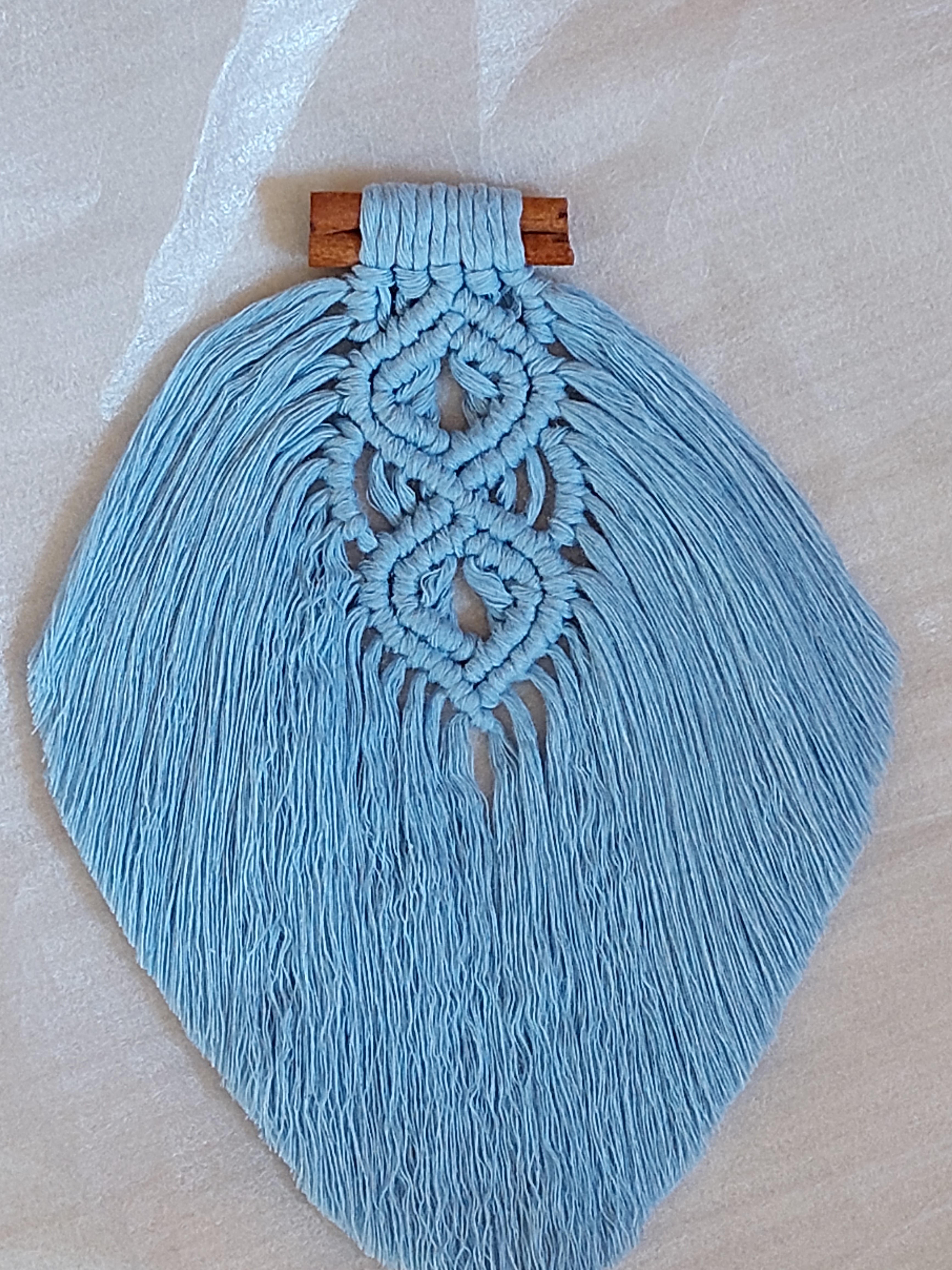 List vyrobený technikou macramé a vypracovaným středem. Bavlněná příze síly 2mm, zavěšeno na válečku skořice. Rozměr cca 15x20cm.