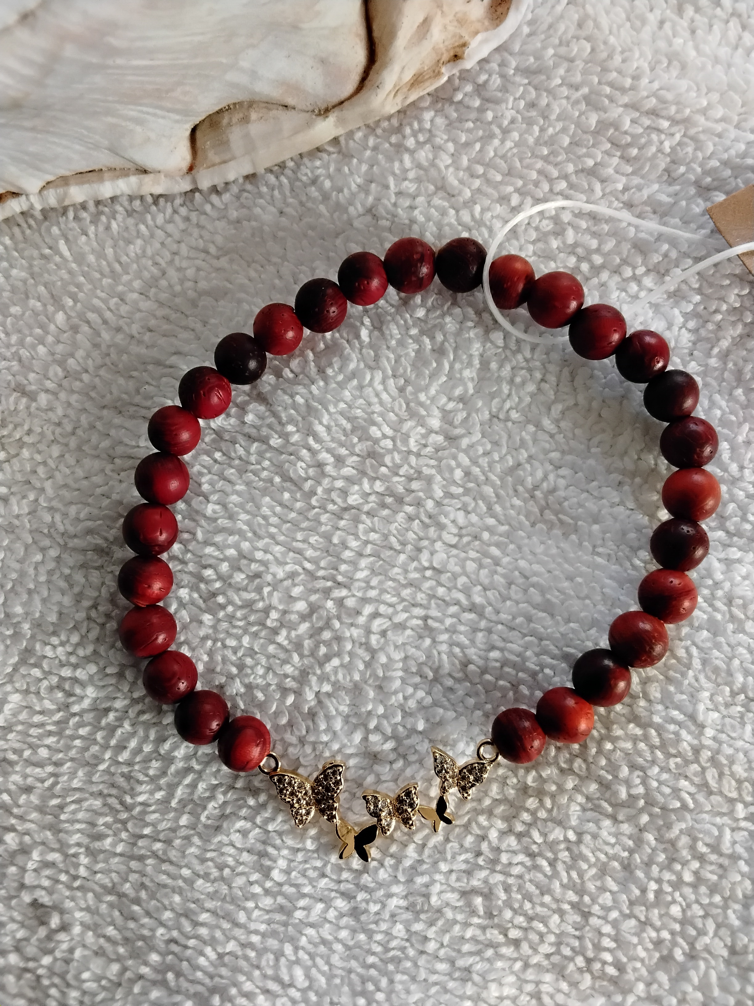 Jemný náramek z korálků palisandrového dřeva s pozlaceným mosazným motivem čtyř motýlků .