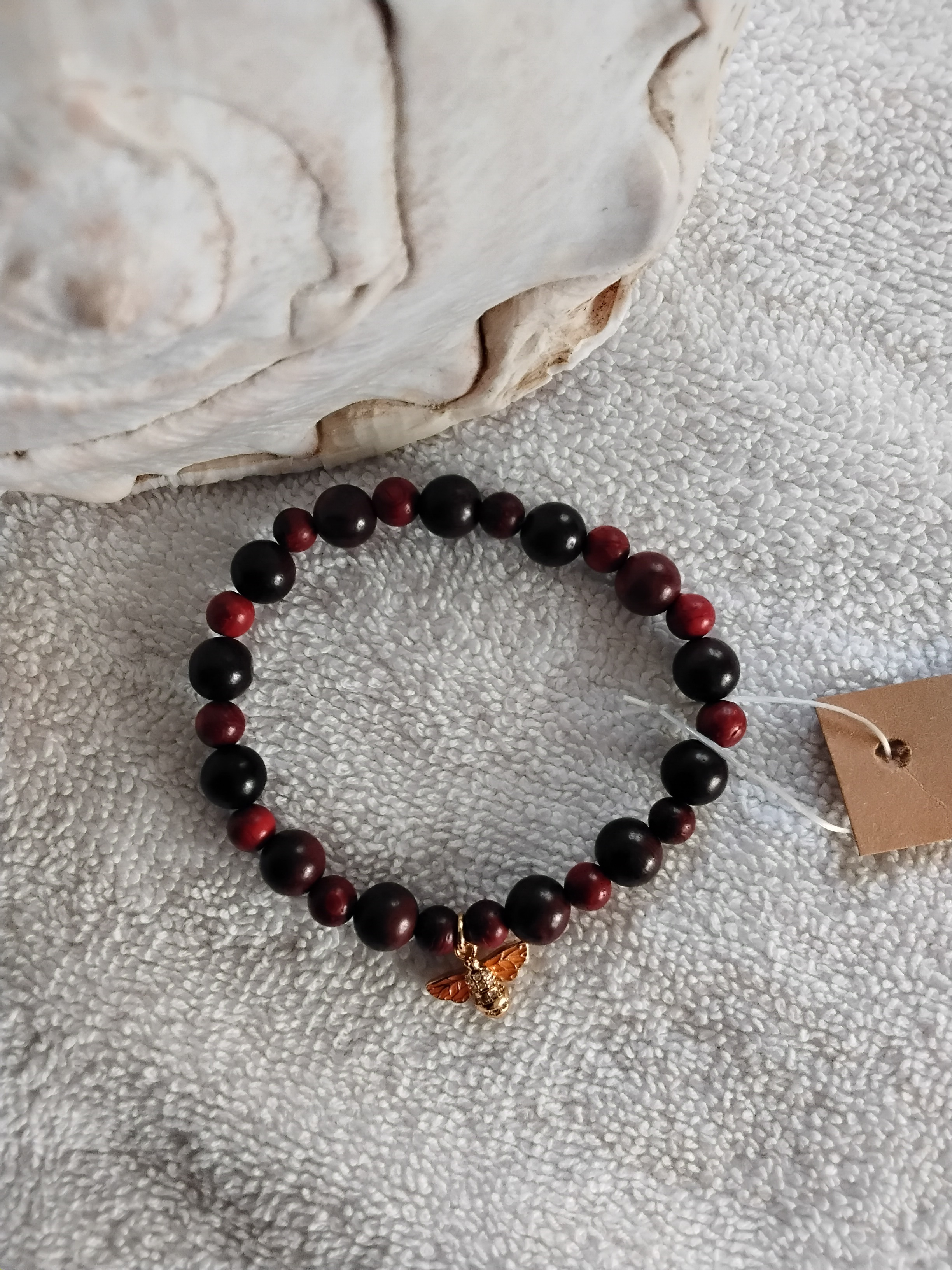 Krásný náramkem z palisandrového dřeva - pravidelně se střídají dvě velikosti korálků. Včelka je z pozlacené mosazi zdobená zirkony.