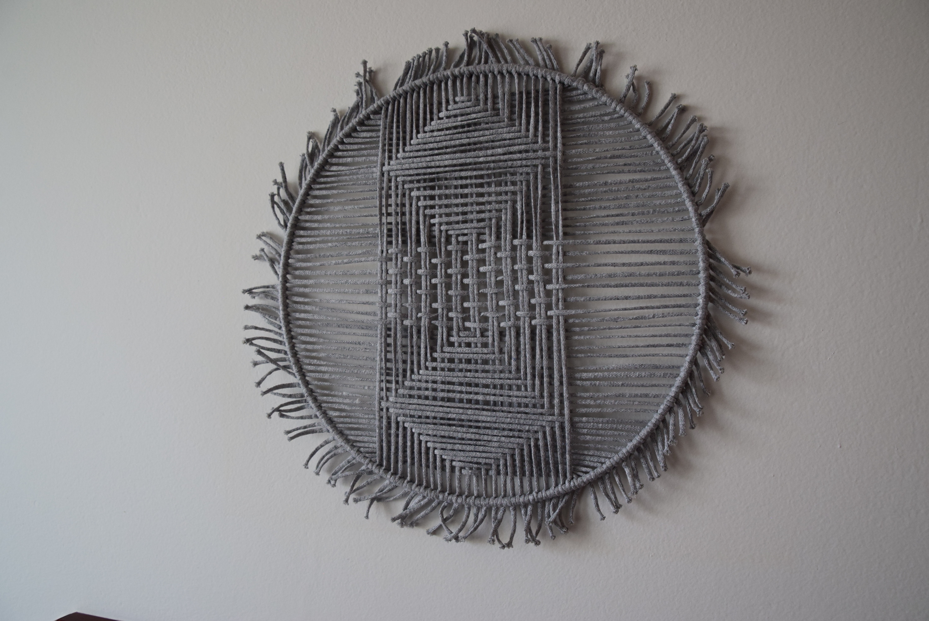 Dřevěný kruh s osnovou příze v šedé barvě proplétanou do obrazců. Průměr kruhu 30cm.