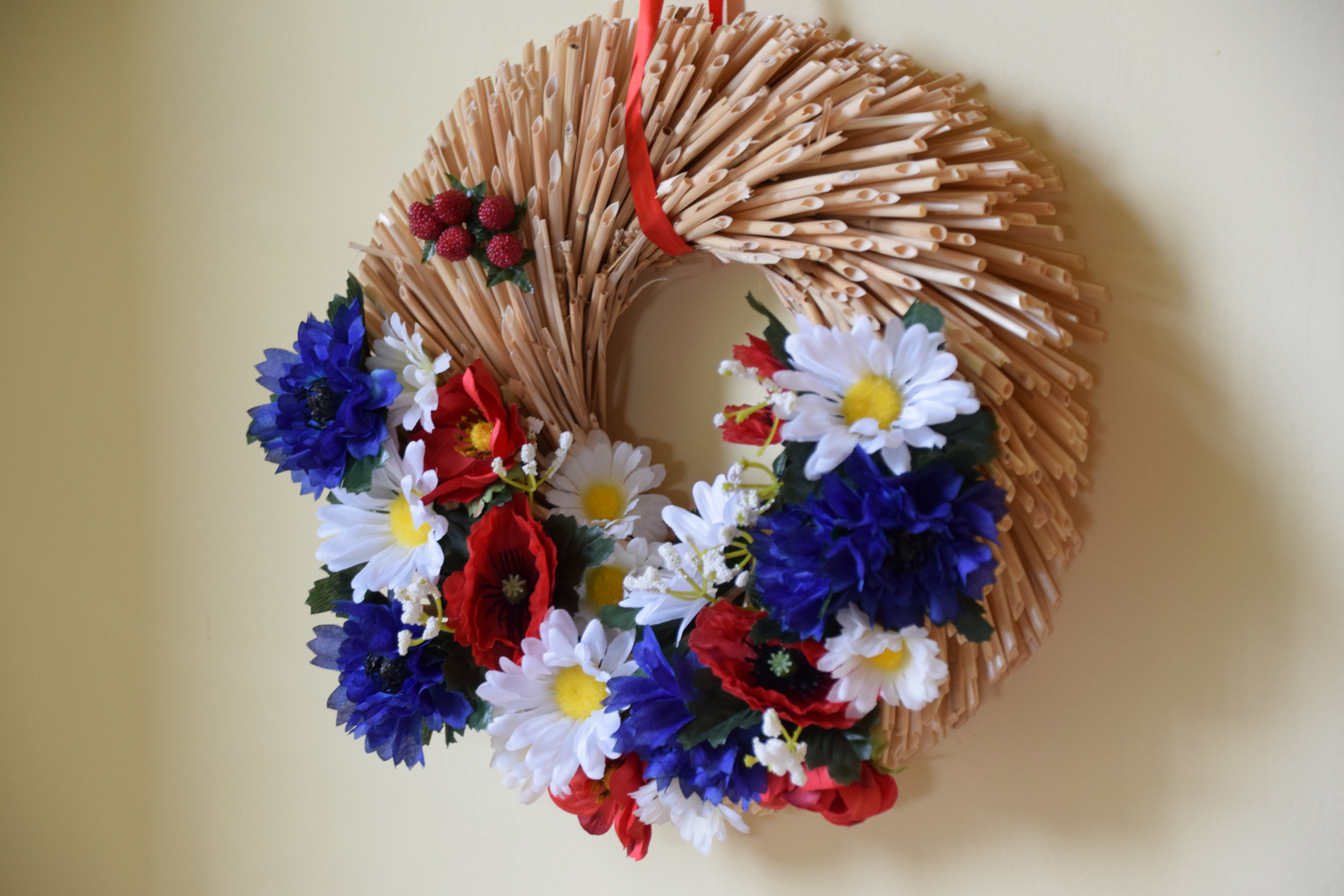 Korpus ze sekané slámy zdobený květy vlčího máku, chrpy a kopretiny, dozdobený skleněnými malinami. Zavěšený na červené stuze. Průměr cca 30cm.